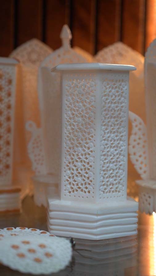 Jaali work – intricate pierced lattice patterns, which are the most popular and characteristic of Lucknow. Often, multiple jaali components (around 5–6 pieces) are created separately and later assembled to form a single product, such as a lamp.