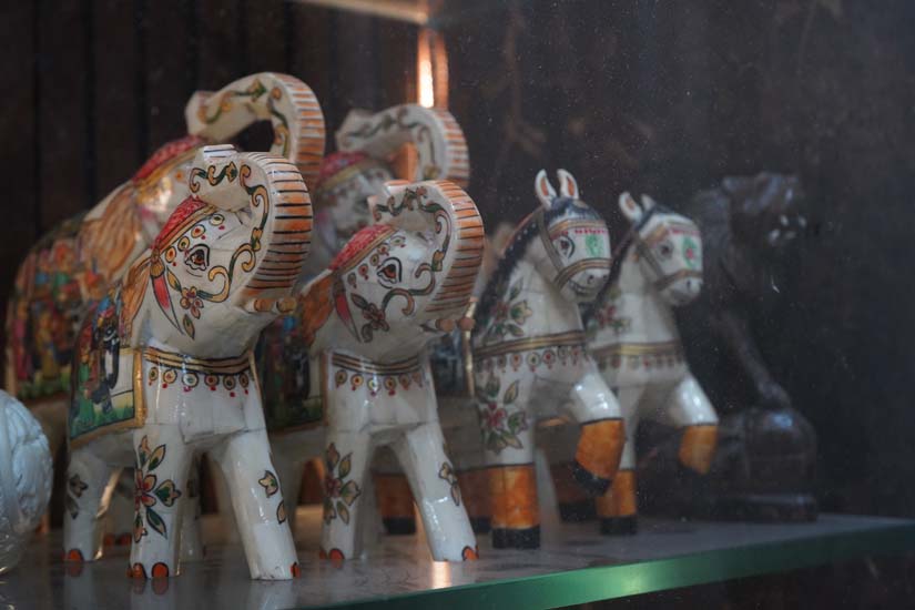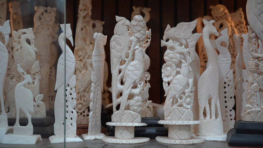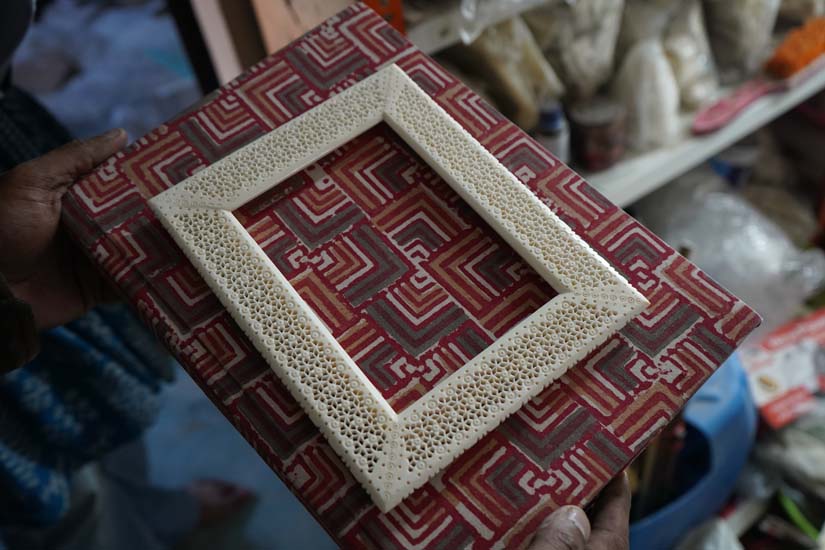 The range of products is extensive, including lamps, paper knives, pen stands, pens, juda (hairbun) sticks, bookmarks, combs, buttons, earrings, necklaces, clocks, vases, rings, pendants, and decorative items such as the ambari elephant. Some products, such as clocks and flower vases, also incorporate painting. In such cases, small square pieces of bone are cut and meticulously assembled onto a wooden base, after which they are sent to Rajasthan for painting. A single flower vase of about two feet in height may consist of 600–700 small bone pieces assembled together.