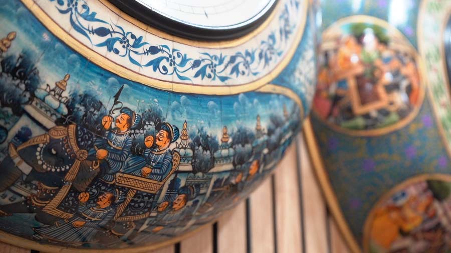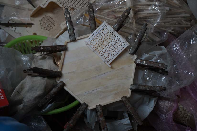 In many cases, especially for larger items, small pieces of carved bone are joined together using adhesives like Fevicol. These may be assembled onto a wooden base (for example, in lamps or vases) and left to dry for about a day. Some products are further sent for painting to Jaipur, where various visual narratives are painted onto them.