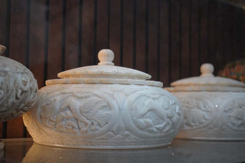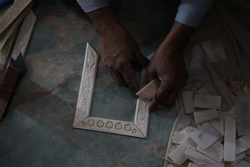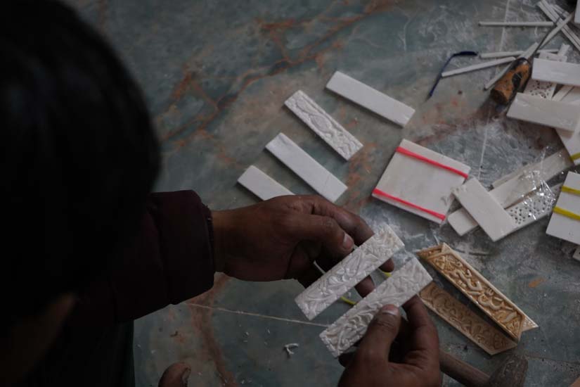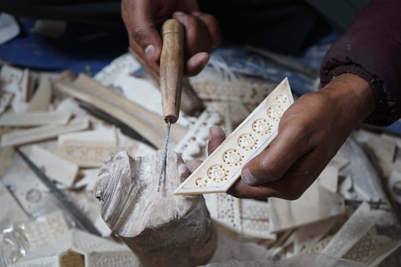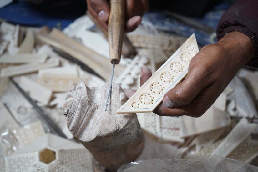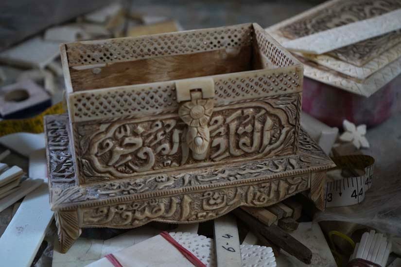 Lucknow was also historically an important centre for ivory carving; however, following the global ban on ivory trade in 1989, artisans transitioned to carving camel and buffalo bone. This shift positioned bone carving as a more sustainable and ethical alternative, as it relies on waste material.