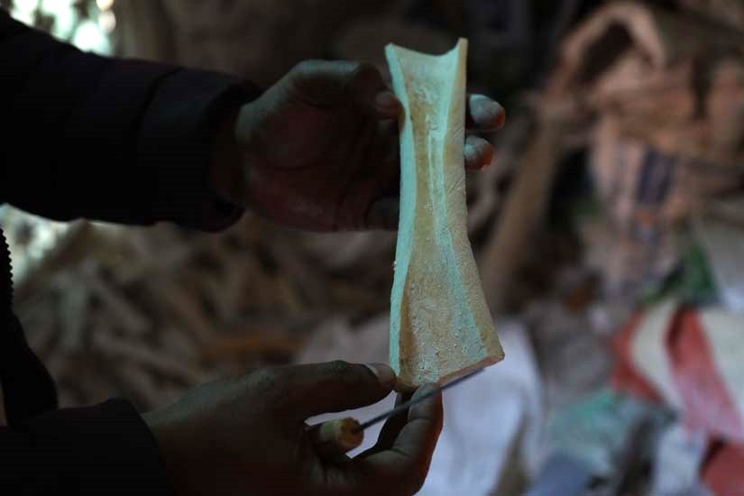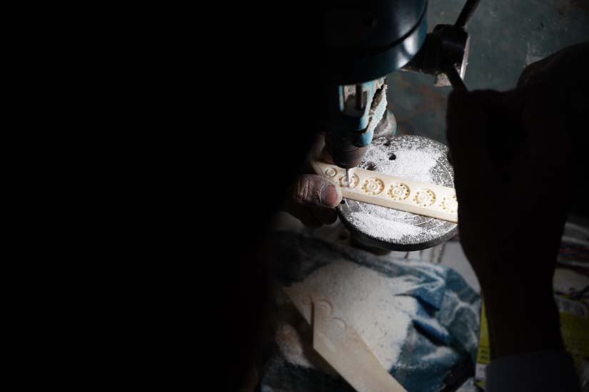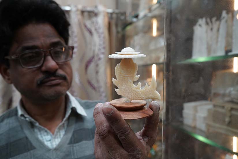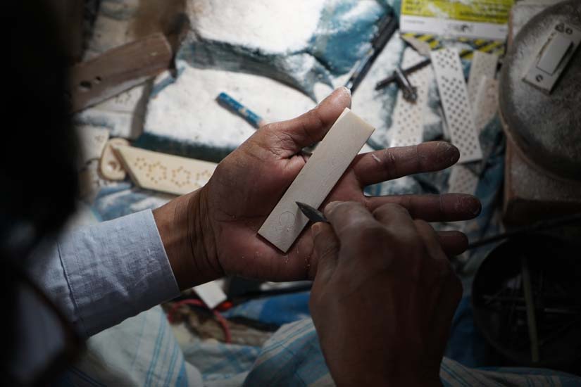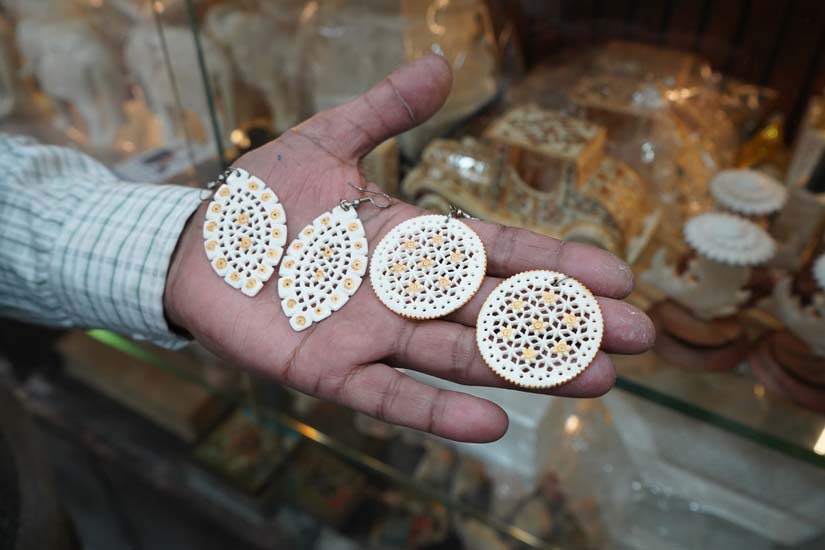 The craft of bone carving has a 4 to 5 day process that involves cutting the bone, boiling it in a soda solution to remove fat, carving, bleaching it with hydrogen peroxide, and polishing. Artisans use specialised tools to carve and shape bones into intricate designs. Using small chisels, gouges, files, and drills, the artisan gradually removes excess material to create the intended form and detailed patterns. The complete process requires great precision, patience, and a deep understanding of the craft.