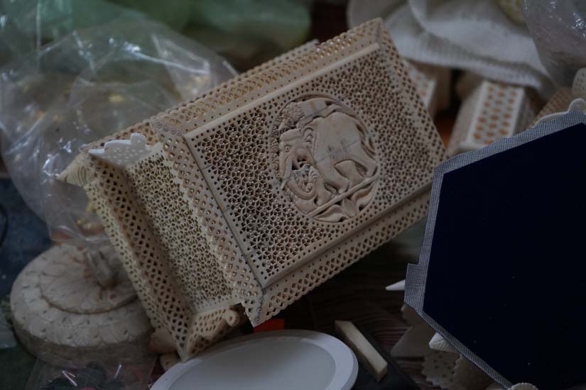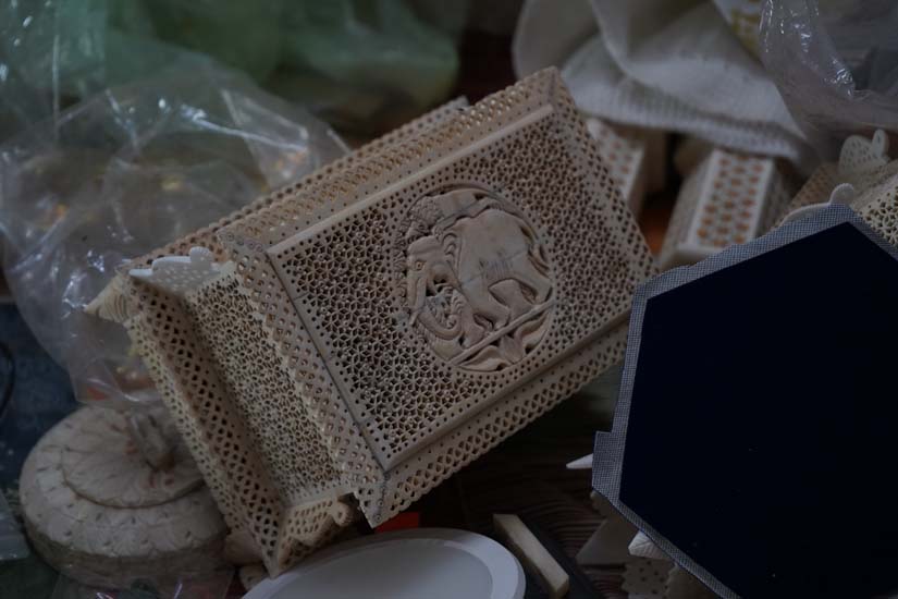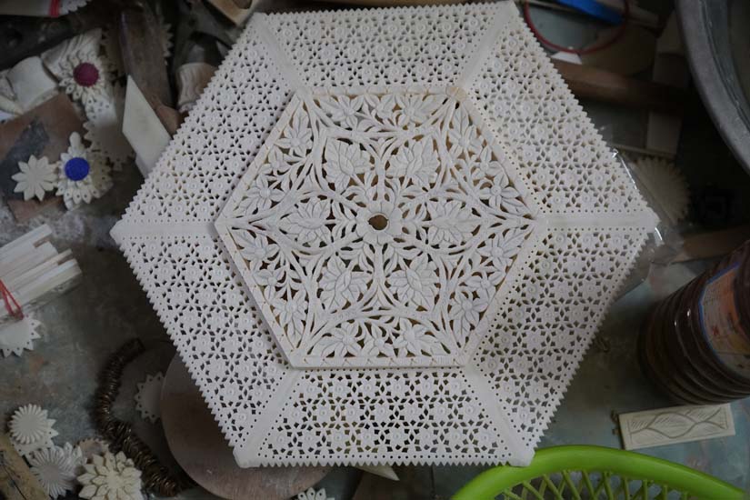 Broadly, the work in Lucknow can be categorised into two types. The first is jaali or lattice work, a defining feature of Mughal architecture, which is extensively used in jewellery boxes, lamps, and other hollow objects. The second is carving designs which is done on thicker pieces of bone and often depicts detailed hunting or forest scenes featuring elephants, tigers, parrots, peacocks, and flowering trees.