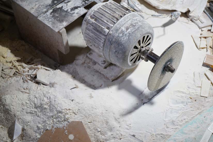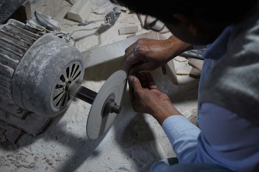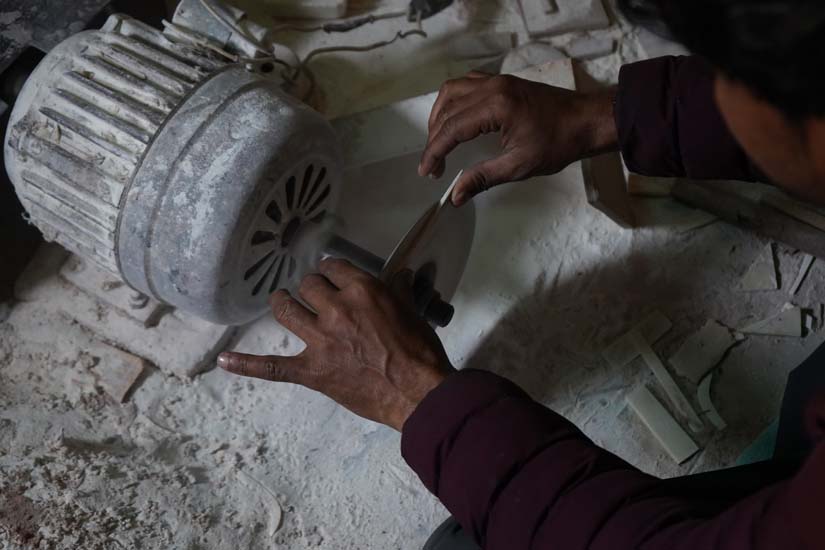 Once cleaned, the bone pieces are dried and then sanded on motor machines fitted with circular plates to achieve a smooth and flat surface.