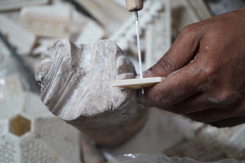 The design process begins with marking the surface. Artisans draw patterns and refine them using a prakar (compass tool) to ensure symmetry and accuracy. The carving is then carried out using tools such as chisels (Teherka/Chausi), files (Reti), and drills. Small holes are created using a drilling machine or a hand drill with fine needles. Notably, intricate jaali (lattice) work is done entirely by hand, as machines cannot achieve the same level of delicacy and control.