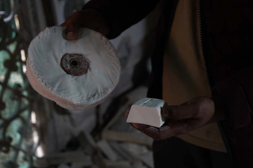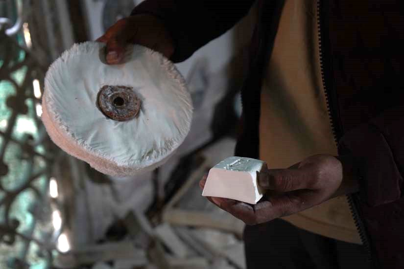 The final stage is polishing and finishing. The product is buffed on a motor machine using buffing soap (polish batti), which enhances the shine and brings out the intricate details.