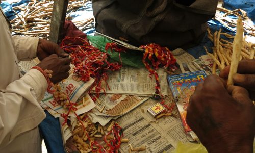 The floor is cleaned first and an old rag or ‘Sadalo’ is spread out. The beads are taken off from their holder thread and sorted in different heaps according to their colors. The sling of the thread is unwound and looped around the toe, while the ends of the thread are held in one hand. With the other hand each thread is taken out one by one.
