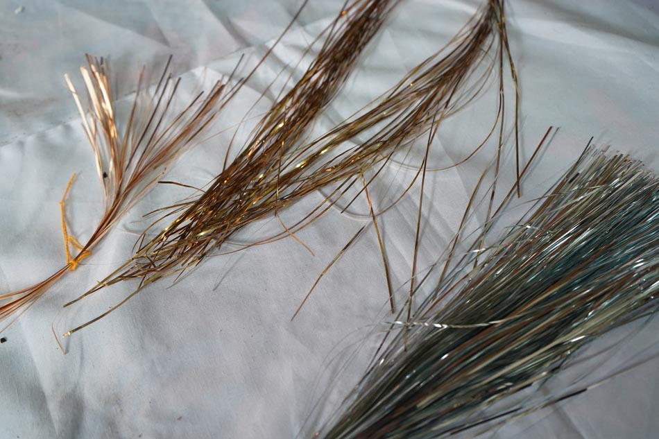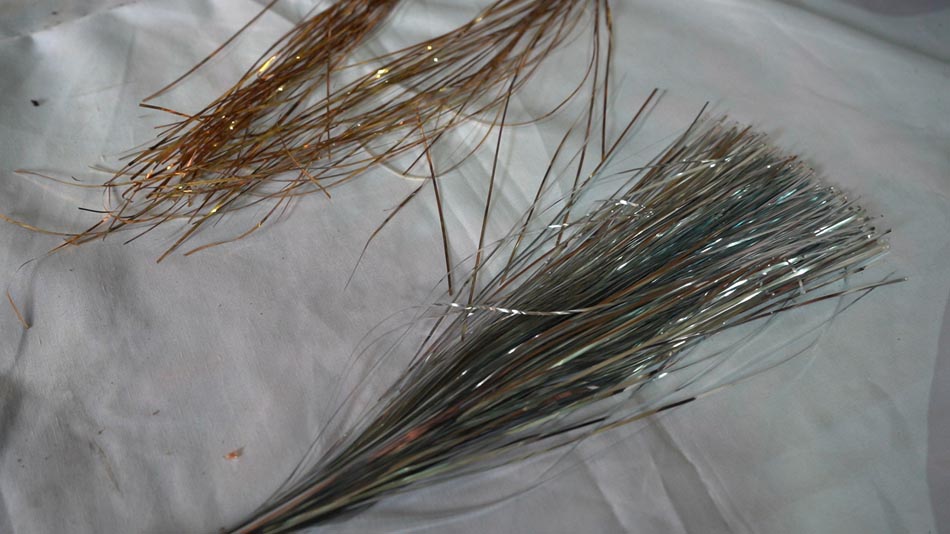 Badla: The primary material used in Mukaish embroidery is badla, a fine, flattened metal wire. Traditionally, (badla) metal wires were made from pure gold and silver, used extensively in royal garments. However, in contemporary practice, it has largely been replaced by copper wires coated with a layer of real silver polish. For gold-toned wires, this silver-coated copper wire is further dyed to achieve various shades of gold. These include tones such as light gold, dull gold, antique gold, black gold, and pure gold. Similarly, silver and copper wires are also available in variations like dull silver and antique copper.