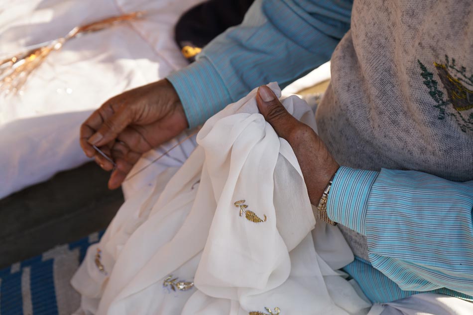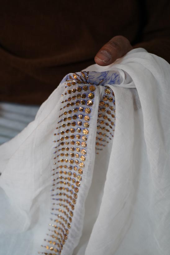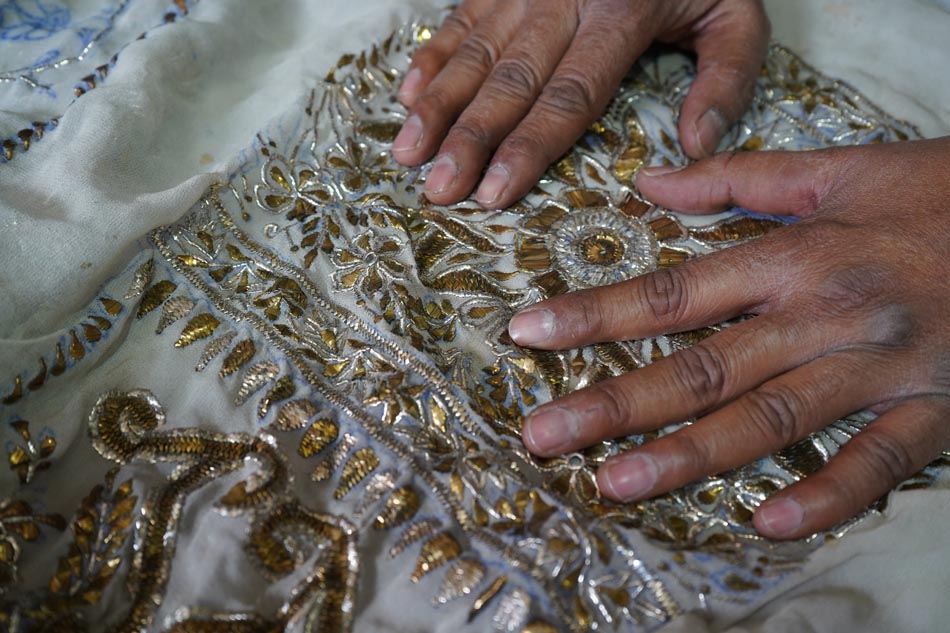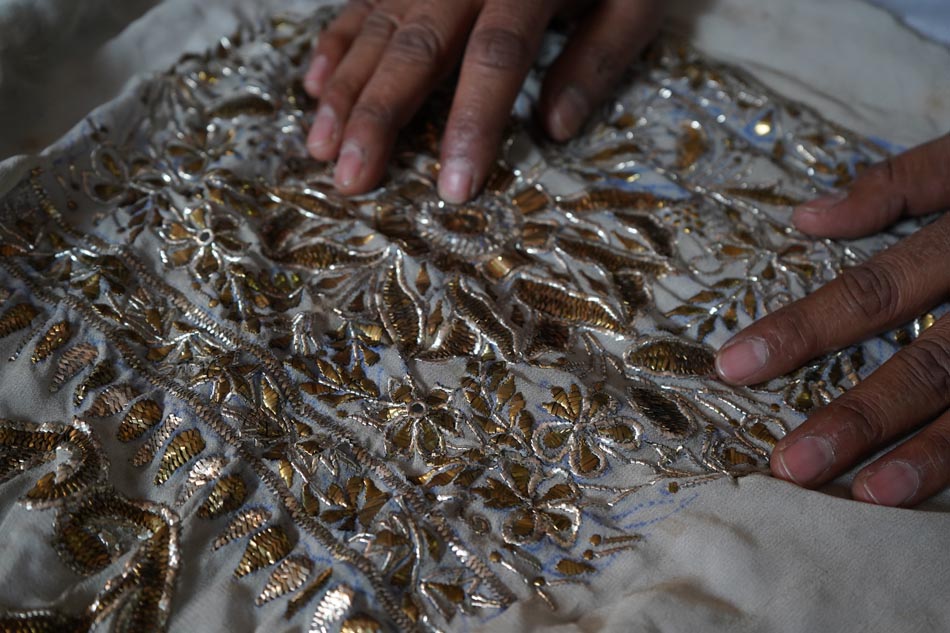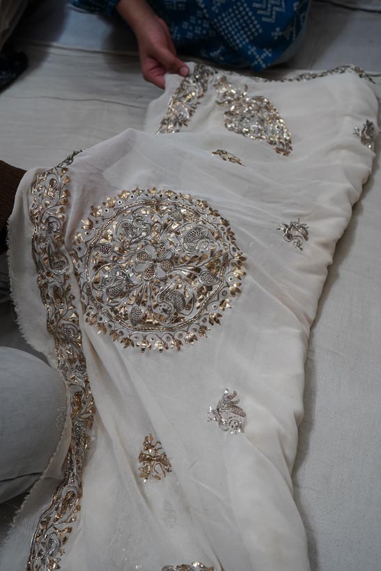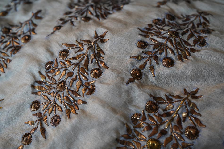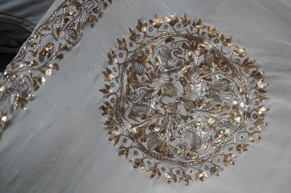 After embroidery, the fabric undergoes ghutaayi, a finishing process where the reverse side is gently rubbed using a cowrie shell. This flattens the badla (metallic wire), burnishes the metal enhancing the shine of the metallic wires.