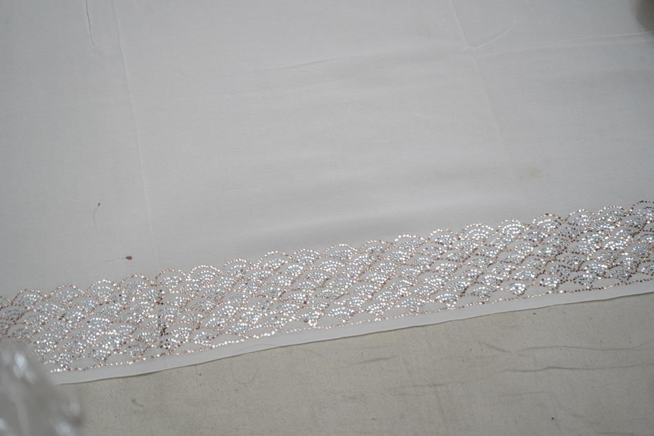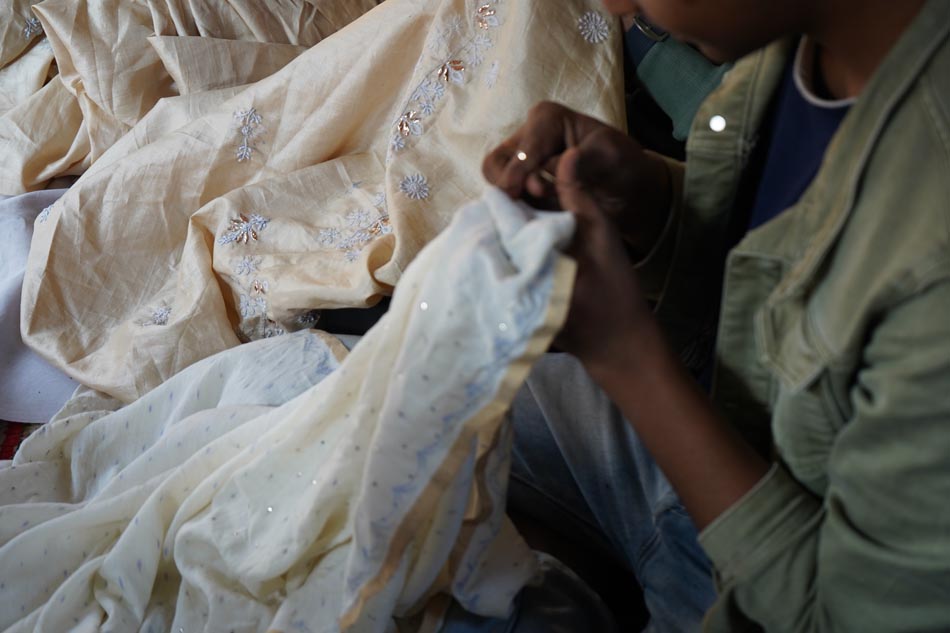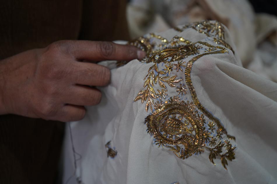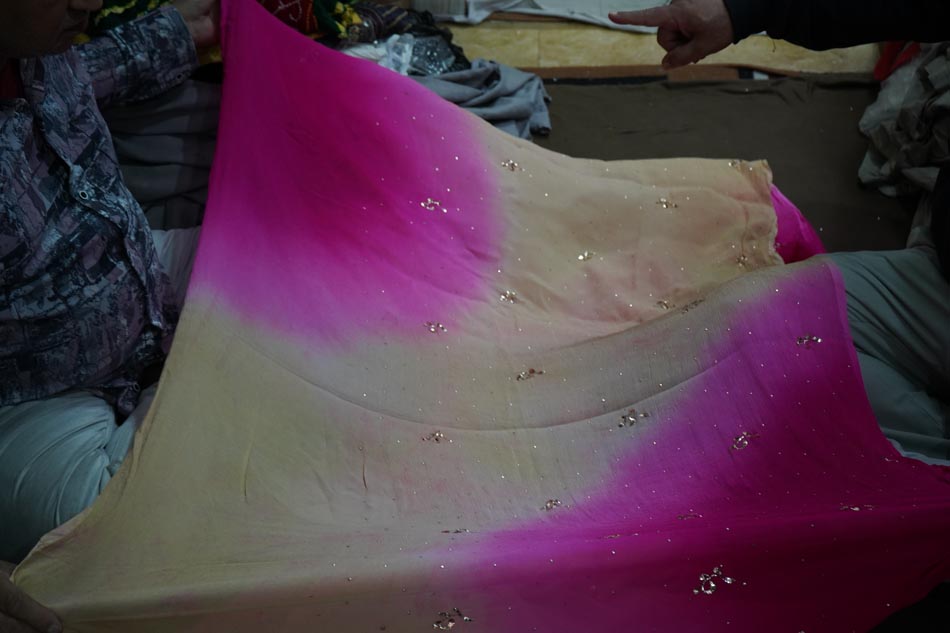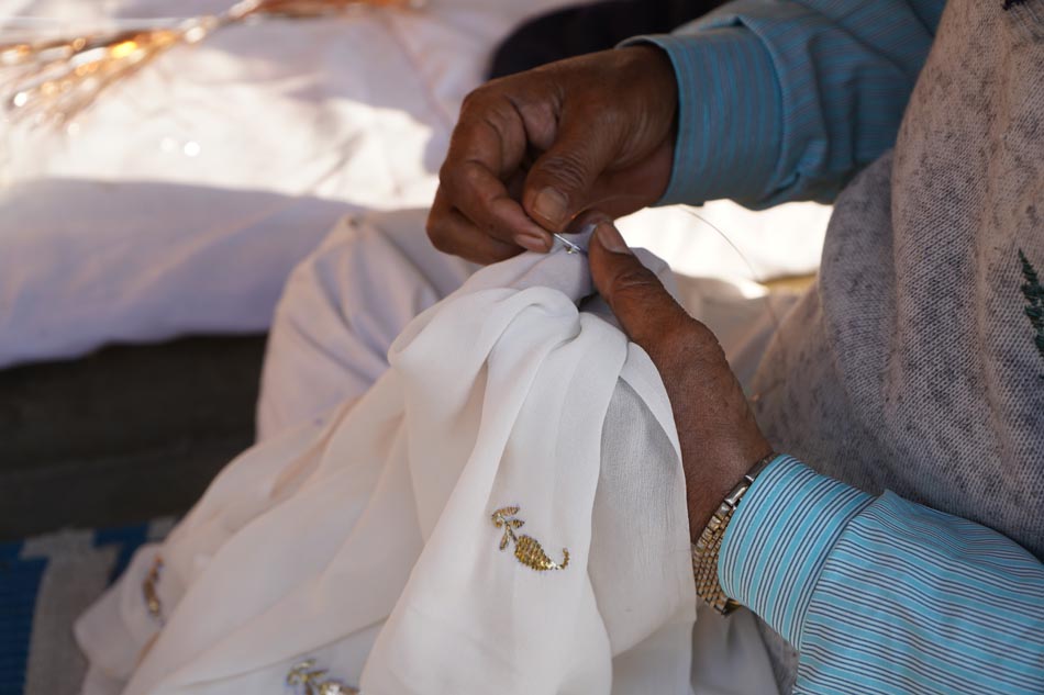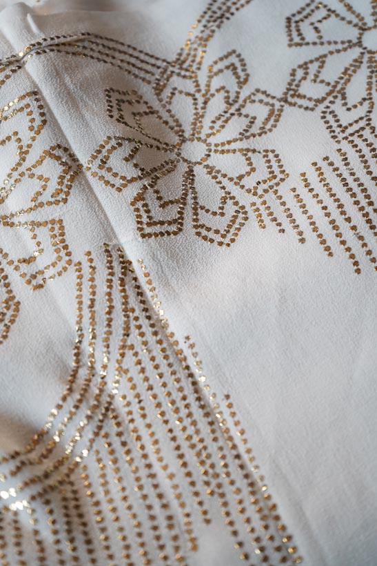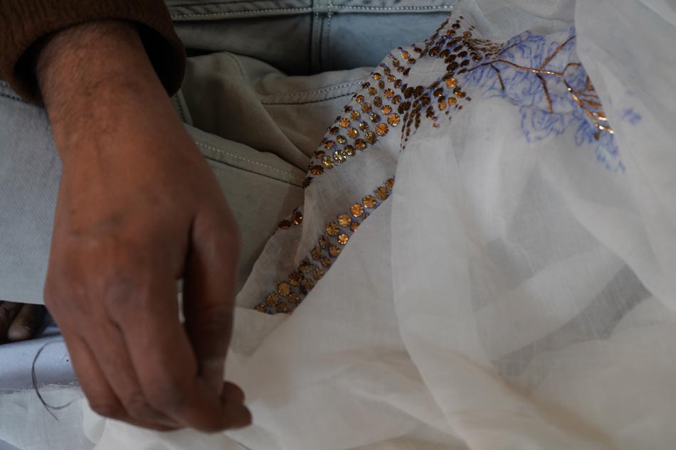 After embroidery, the fabric undergoes ghutaayi, a finishing process where the reverse side is gently rubbed using a cowrie shell. This flattens the badla (metallic wire), burnishes the metal enhancing the shine of the metallic wires.