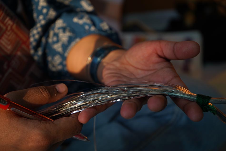 In the process of Mukaish work, very little waste is generated. Small leftover pieces of badla wire may go to waste, as entire strands are not always fully utilised during embroidery. Additionally, the water used to wash off the neel solution for tracing becomes waste after use. Tracing paper, although reusable, can only be used up to around 20–25 times; after repeated use, it loses clarity and is eventually discarded.
