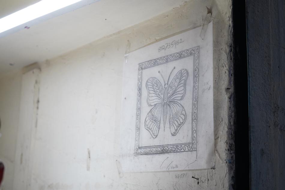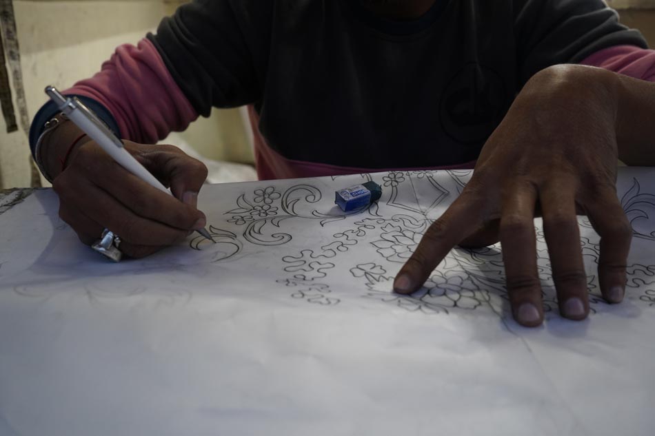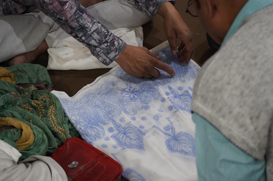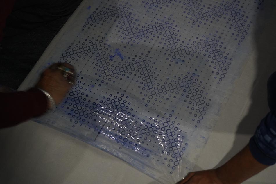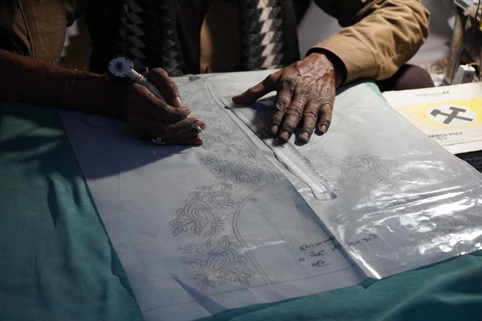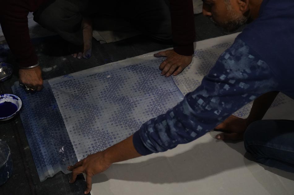 The process begins with creating the design on tracing paper. The design is perforated with small holes using a needle (sui), allowing the transfer of the pattern onto fabric. A mixture of neel (indigo powder) and kerosene oil (mitti ka tel) is applied over the tracing sheet using a cloth, transferring the dotted design onto the fabric. This process, known as chapaayi, is typically carried out on the floor with fabric spread over a carpet. One tracing sheet can be reused up to 20–25 times, and usually requires two people to execute the transfer accurately.
