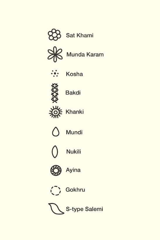 The craft involves numerous stitches, commonly referred to as takkas. Some of the widely practiced stitches include Patti, Singarkhe, Gitte (moong ke taake ki gitti), Chhoti Fardi or Daana (also known as Fardi ka kaam and highly in demand), Sat Khami, Kharaki, Bakdi, Kosha, Munda Karam, Mundi, Nukili, Murri, Salemi (S-type), Ayina (theda takka), Gokhru, Jooth, Path (barha hua kaam), Orma (outline), Kota (criss-cross), and Jali work, which creates a net-like effect on the fabric using Mukaish. some popular styles are.