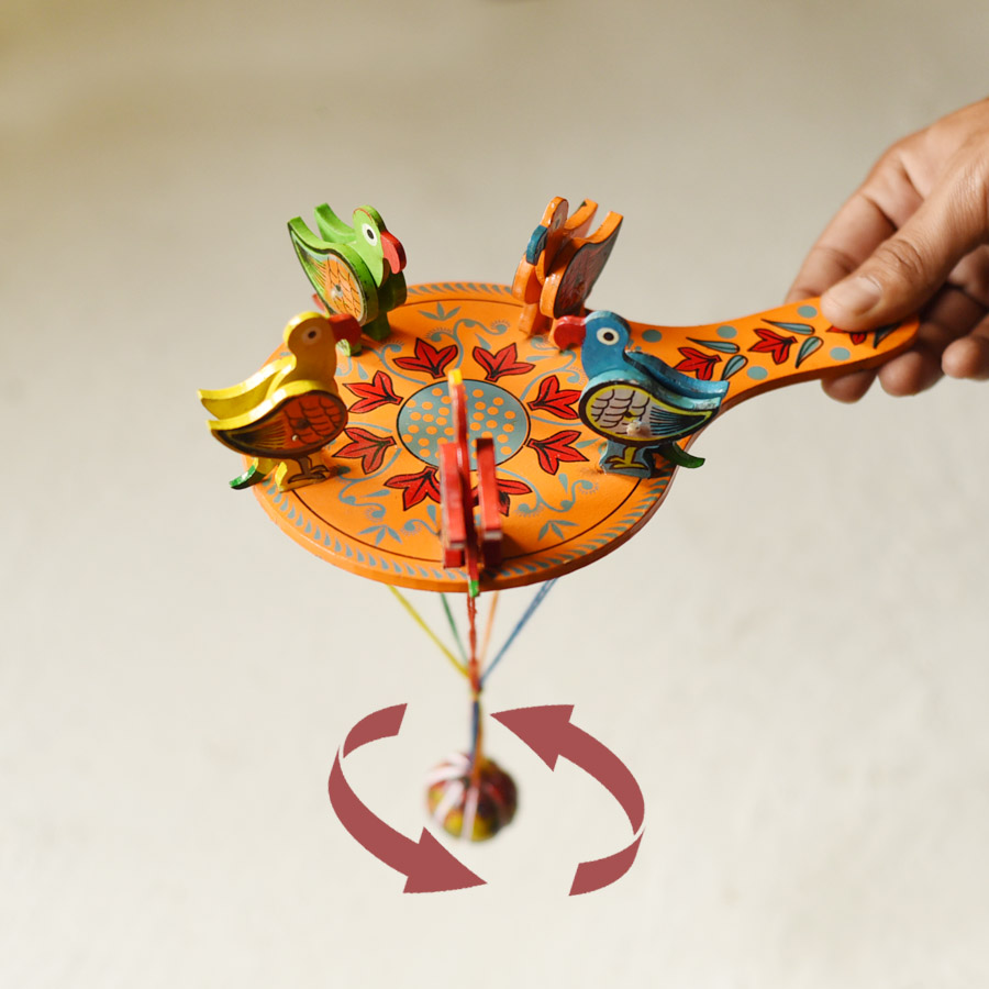 Artisans from the Prajapati community are traditionally involved in painting these wooden toys. In earlier times, before the availability of acrylic paints and watercolours, natural dyes were used. Colours were derived from materials such as turmeric (haldi), henna (mehndi), and ratanjot, as well as from boiled flowers and leaves. These natural pigments were applied using cloth rather than brushes, giving the toys a distinct finish and character.