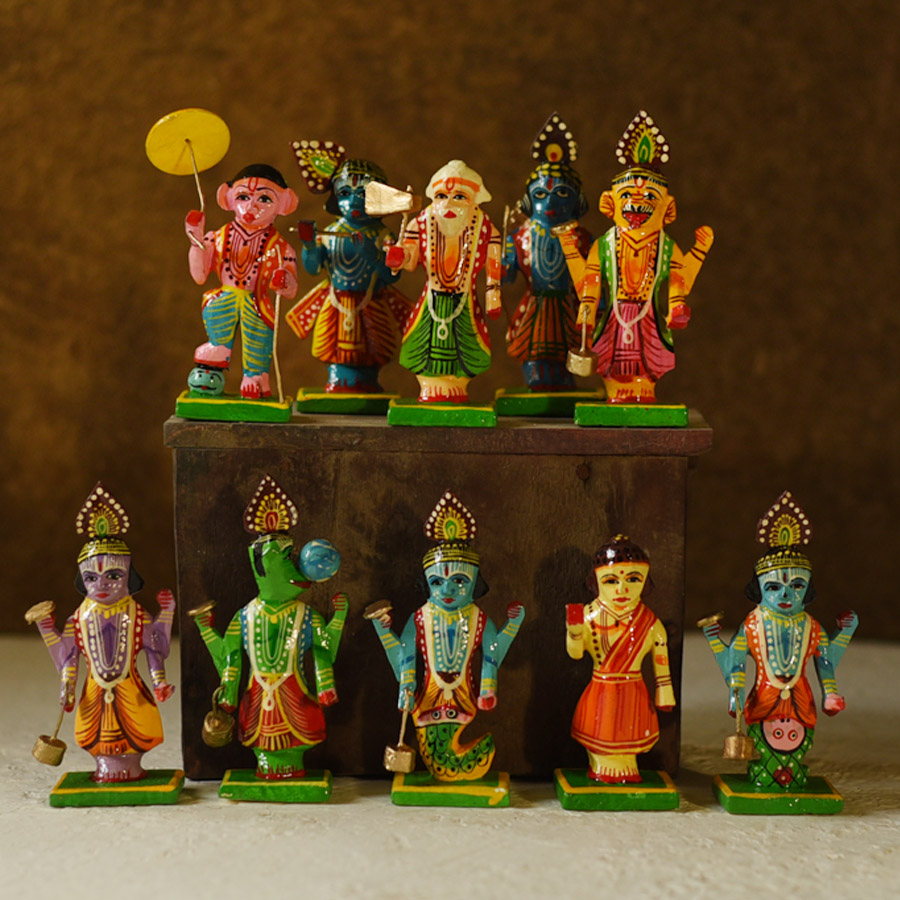 Some of the prominent wooden toys include Dana Chugni (Birds eating rice), Bawala Set (a set of six musicians playing instruments), Ramnagar ke Kashi Naresh Raja (the King of Banaras seated on an elephant), autos, rickshaws, bullock cart, a set of the ten avatars of Vishnu, Ambari Hathi (ceremonial elephant with a covered seat on its back for the rider) and sets of animals or birds. The town being a pilgrimage centre, the toys mostly represent deities from Hindu mythology.