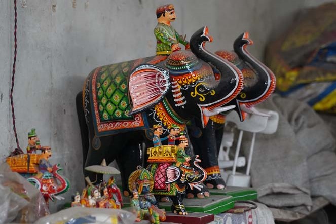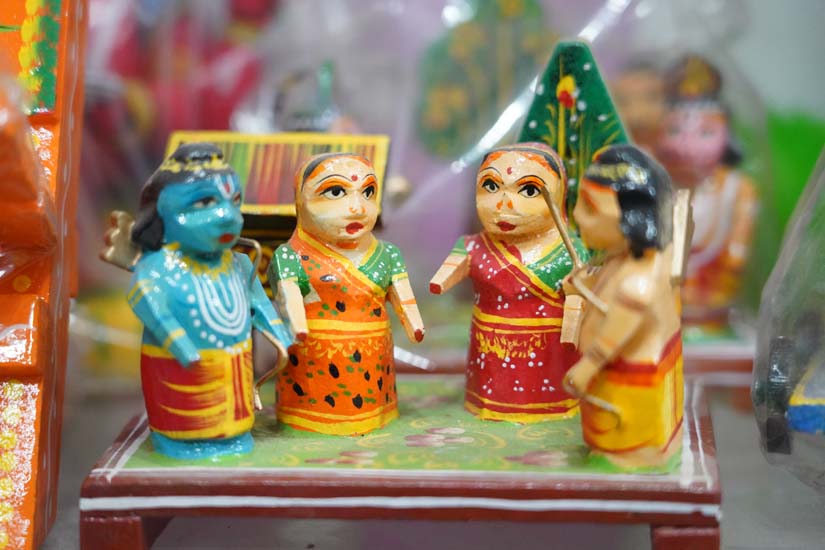Many of the colourful items depict scenes from village life, including bullock carts, elephants, and women carrying pitchers. Miniature sets of wooden cooking vessels are also produced in large quantities. Traditional idol sets of gods and goddesses are in high demand during festive occasions.