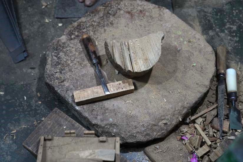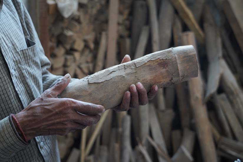 Wooden logs are purchased from nearby markets and stored by the artisans. These logs are got cut into the required sizes using an aara machine available in the local markets of Varanasi. This machine is quite large, occupying around 400 square feet of space, and is therefore not installed at the artisans’ workplaces.