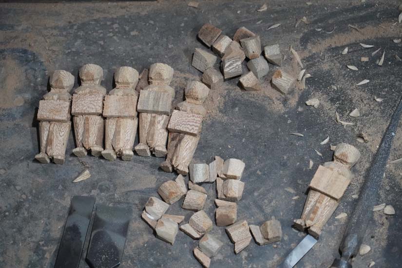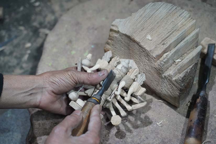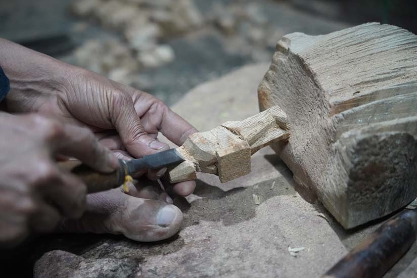These toys are made in two ways, either carved from a single piece of wood or assembled from multiple individually carved parts. Once carving is complete, different components such as the head, hands, base, legs, and various accessories are joined together using Fevicol. For certain structural details, iron rods are also used to provide strength and support.