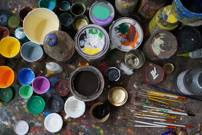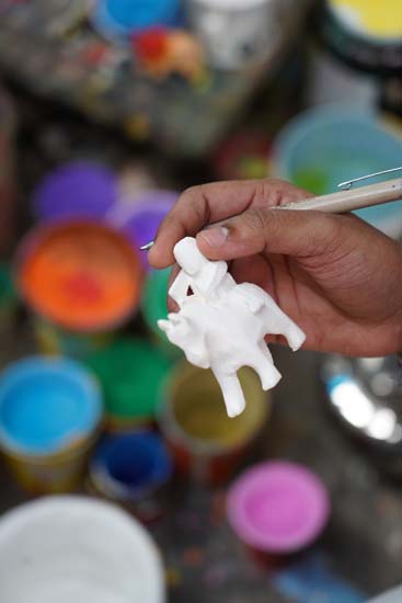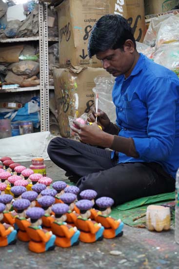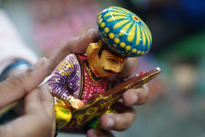 Before painting the final product, artisans often create a sample toy to finalize the colours beforehand. Acrylic colours are then used for painting. Only one colour is applied at a time, a batch of toys are painted with a single colour, allowed to dry, and then the next colour is applied. Painting is carried out step by step on batches of 50–100 toys,first the faces, then the body, clothes, and other details. A darker tone of the same colour is used for shading after the base layer. Fine details are added using small-sized brushes.