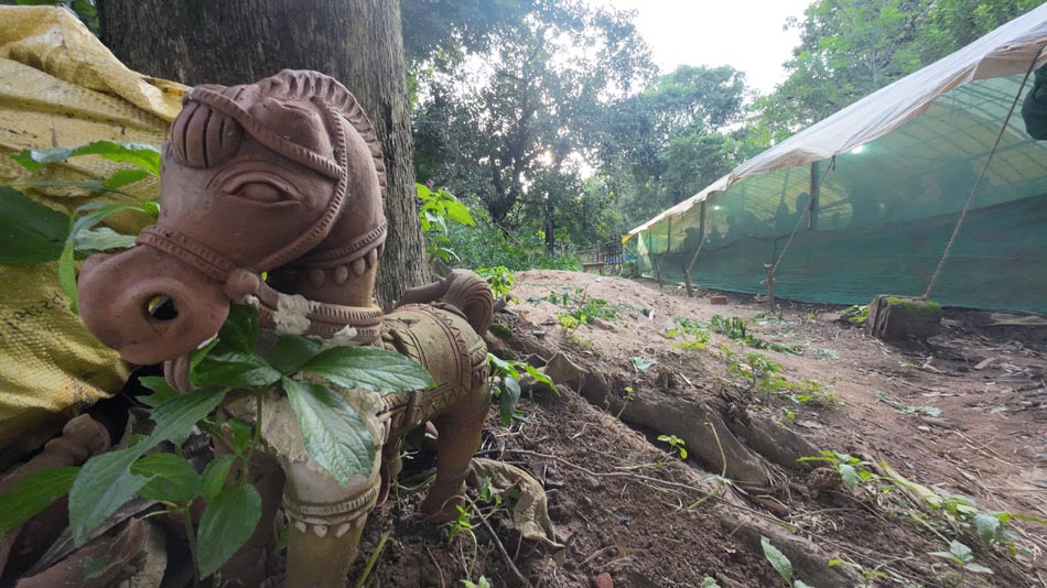 The clay figures of local gods were kept near the border of the village to safeguard the tribes by preventing the entry of evil spirits. In the beginning, the tribals primarily offered the figures of animals like elephants and horses. In the tribal culture, trees symbolize sacred spaces where the tribes revere their local gods and goddesses. Devkot is one such sanctified place in the forest near Kumahar Para, surrounded by trees. It is a place of worship where votive terracotta figures are offered for the blessing of the local Gods (Vaswani, n.d.). Another sacred space for the locals is a hut-like structure known as the Devgudi Temple, which is dedicated to the village’s Goddess. Elephant and horse sculptures are found inside the temple. Interestingly, a terracotta lamp called ‘Mata diya’ is also kept inside, which always remains lit.