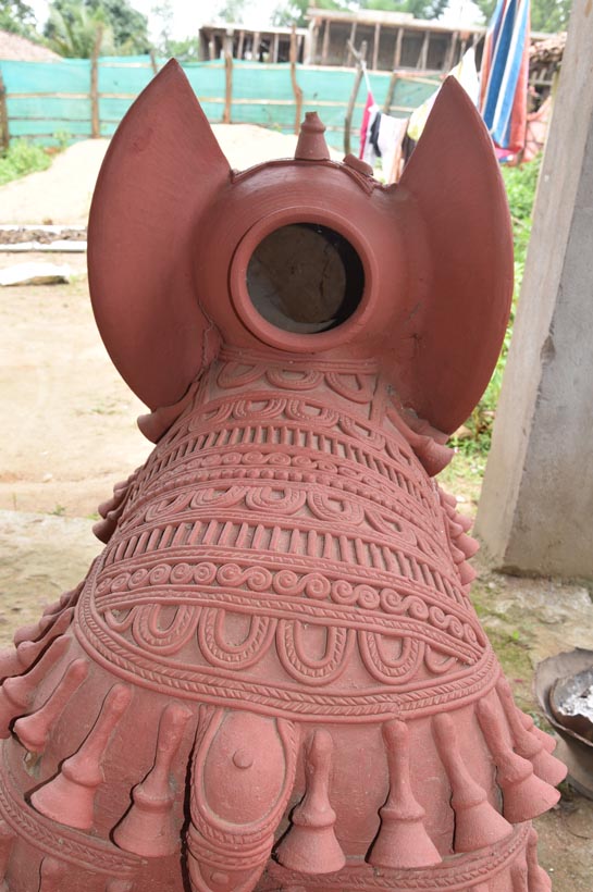 In Kumhar Para village, the practice of terracotta initially began with objects made exclusively for gods and goddesses. The most iconic figures are elephant and horse sculptures, which are offered during worship. These sculptures are intricately designed and decorated with detailed ornamentation, drapes, and sometimes even bells. Another important category includes pola toys, which feature items such as bulls, chakki (grinding stones), and miniature kitchen utensils. Artisans also created objects for rituals and wedding ceremonies, including lamps and figurines. Terracotta objects were often exchanged as gifts during festivals and special occasions.