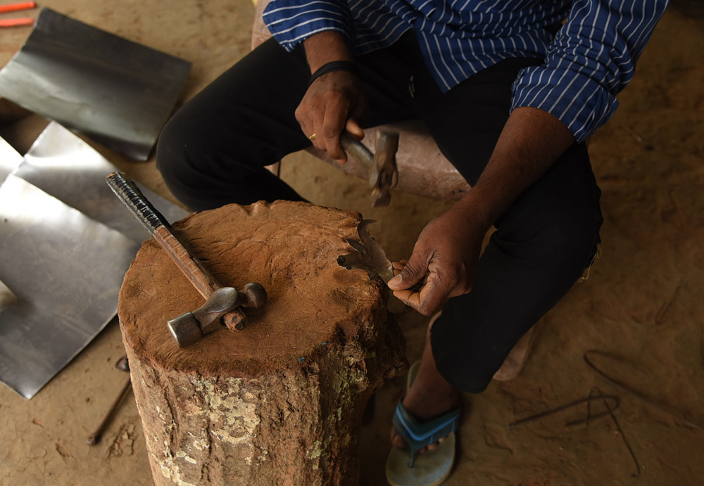 – Using a hammer and chisel, they either cut the sheet or start forming the shape directly by beating the iron. During this process, the metal is repeatedly heated in the fire to keep it workable.