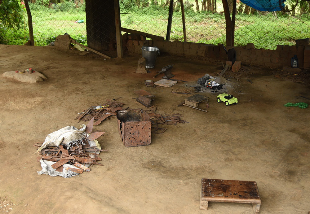 Master artisan Teju Ram explains how iron objects have been associated with the tribal community from birth to death. For every stage of life and every task, specific iron tools and objects play an important role. When a baby is born, a specially made knife is used to cut the umbilical cord. In farming, tools such as phaar (attached in front of the plough), goli (used to join two parts of the plough), hasiya (for cutting crops), bidna (to make holes in wood), and haskud or sumela (part of potiya, used for beating paddy) are essential.