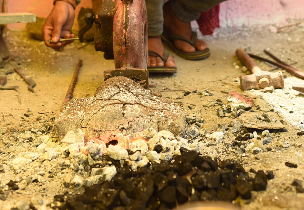 – A simple workspace is set up, and the bhatti (furnace) is prepared.